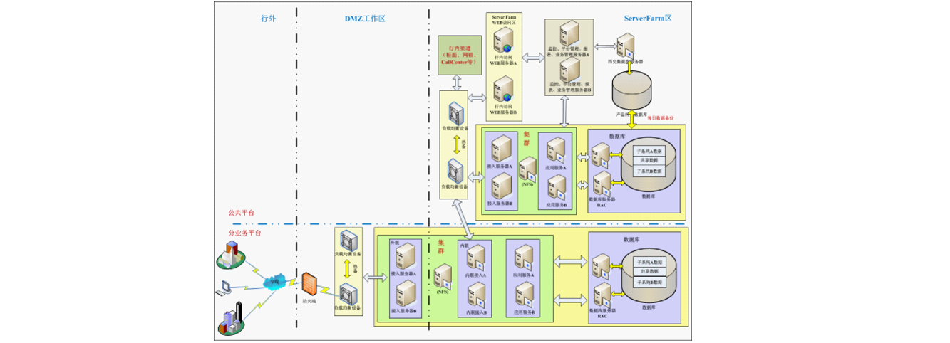 系统为二级部署,总业务平台与行内其它服务系统,行内渠道系统顺利获得负载均衡设备实现集群部署和访问,而总平台和分业务平台之间业务是顺利获得负载均衡设备实现集群部署和访问,实现业务量增长的横向扩展。